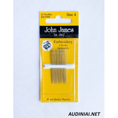 Gamintojo John James adatos siuvinėjimui yra sukurtos pagal bendros paskirties adatų modelį t.y. aštrios, vidutinio storio adatos. Vienintelis šių adatų skirtumas – prailginta akutė siūlo įvėrimui. Tokio tipo akutė leis patogiau įverti net ir kelias siuvinėjimo siūlų gijas. Rinkinį sudaro dvylika vienodo ilgio adatų.