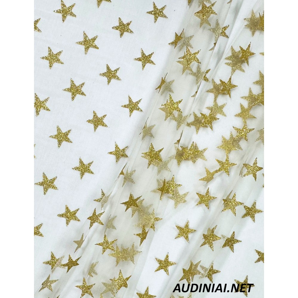 Blizgiomis žvaigždėmis dekoruotas tiulis. Tai tamprus ir kiek kritesnis, 25 milimetrų skersmens dydžio žvaigždėmis dekoruotas tinklelis. Šį tiulį galite rinktis drabužių ar jų detalių, įvairių aksesuarų ar šventiškiausių švenčių dekoro elementų kūrimui.
