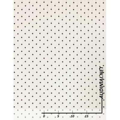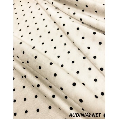 95% viskozės ir 5% elastano raštuotas trikotažas Jersey. Tai 4 milimetrų skersmens dydžio taškeliais margintas, tamprus, gero kritimo trikotažas. Vidutinio storio, neperšviečiamas trikotažas yra puikus pasirinkimas tiek labiau prigludusių, tiek ir laisvesnių suknelių ar palaidinių, sijonų siuvimui.