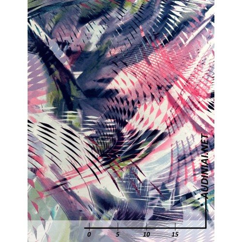 Išraiškingais raštais margintas trikotažas Jersey. Tai itin gero, sunkaus kritimo ir kiek slidus trikotažas, kurį rekomenduojame rinktis tiek laisvesnių, tiek ir daugiau prigludusių suknelių, sijonų ar įvairių modelių palaidinių siuvimui. Tamprus, vidutinio storio ir visiškai neperregimas, neglamžus, 100% poliesterio trikotažas.