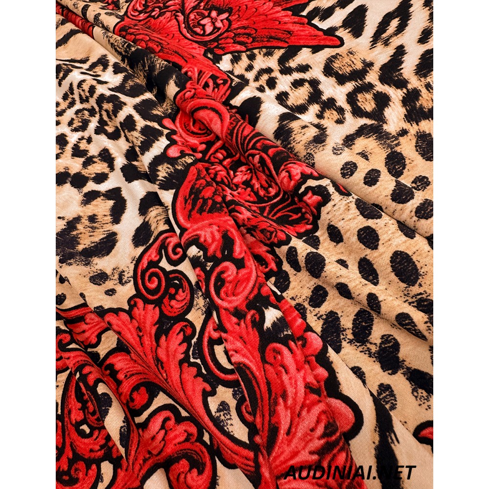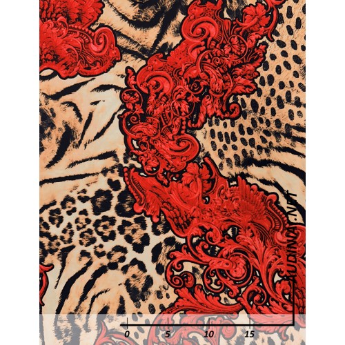 Išraiškingais raštais margintas trikotažas Jersey. Tai itin gero, sunkaus kritimo ir kiek slidus trikotažas, kurį rekomenduojame rinktis tiek laisvesnių, tiek ir daugiau prigludusių suknelių, sijonų ar įvairių modelių palaidinių siuvimui. Tamprus, vidutinio storio ir visiškai neperregimas, neglamžus, 100% poliesterio trikotažas.