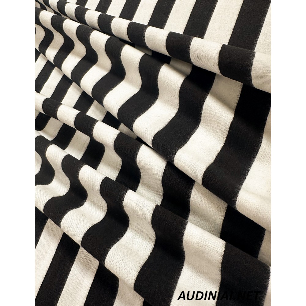 Kiek storesnis, horizontalių dryžių trikotažas Jersey. Šį neperšviečiamą trikotažą rekomenduojame rinktis visų tipų viršutinių drabužių ar aksesuarų siuvimui. Tai tamprus, 100% medvilnės trikotažas.