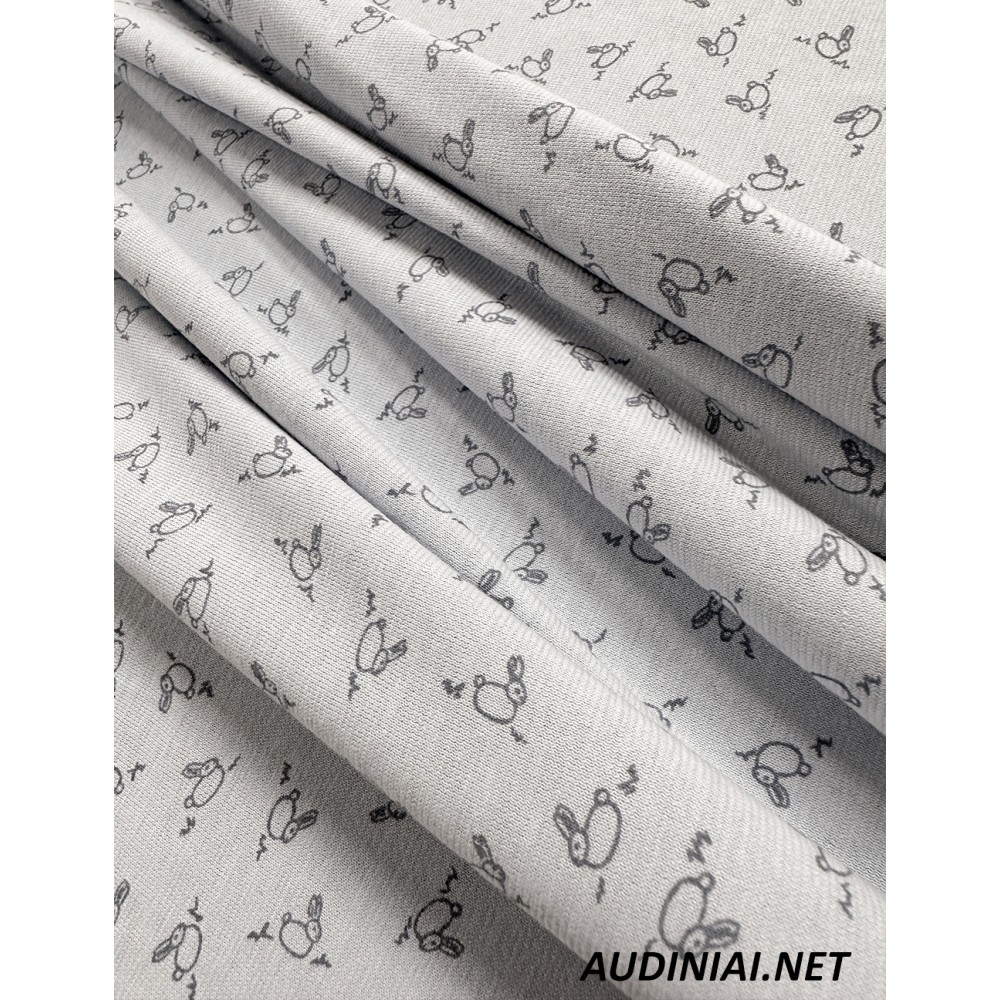 100% medvilnės raštuotas trikotažas Jersey. Tai tamprus, gero kritimo, nepaprastai mielai atrodančiais zuikiais margintas trikotažas. Vidutinio storio, neperšviečiamą trikotažą galite rinktis plataus spektro vaikiškų drabužių siuvimui.
