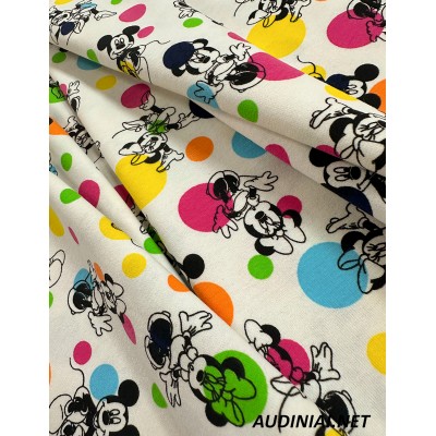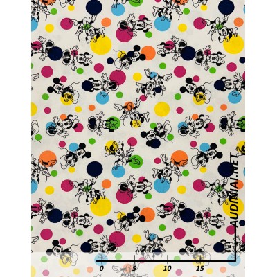 Peliukų Minės ir Mikės motyvais margintas trikotažas Jersey. Neperšviečiamą, vidutinio storio trikotažą rekomenduojame rinktis visų tipų viršutinių drabužių ar aksesuarų siuvimui. Tai tamprus, 70% medvilnės, 26% poliesterio ir 4% elastano trikotažas.