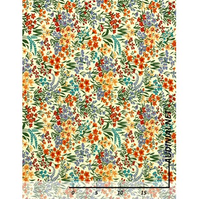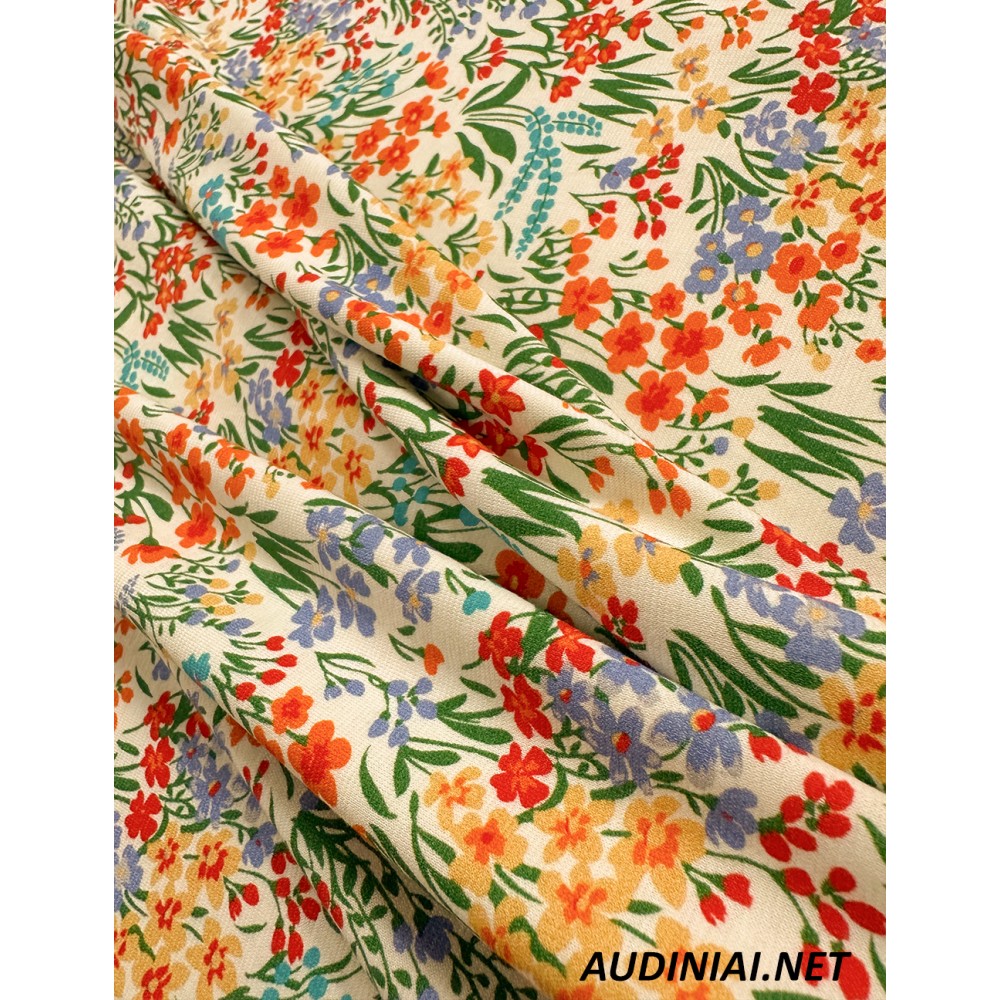 Spalvotais gėlių motyvais margintas trikotažas Jersey. Neperšviečiamą, vidutinio storio trikotažą rekomenduojame rinktis visų tipų viršutinių drabužių ar aksesuarų siuvimui. Tai tamprus, 100% medvilnės trikotažas.