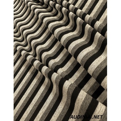 Horizontalių dryžių trikotažas Jersey. Neperšviečiamą, vidutinio storio trikotažą rekomenduojame rinktis plataus spektro viršutinių drabužių ar aksesuarų siuvimui. Tai tamprus, 62% poliesterio, 32% viskozės ir 6% elastano trikotažas.