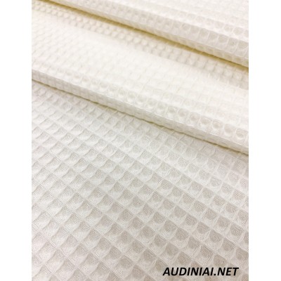 100% medvilnės, prancūziškas vaflinis audinys. Tokio tipo audinys, dar vadinamas koriuku, dažniausiai naudojamas virtuviniams ar vonios rankšluosčiams siūti. Anksčiau minėtas audimo būdas pasižymi tuo, jog puikiai sugeria įvairaus tipo skysčius. Šio gamintojo, itin purios tekstūros vaflinius audinius drąsiai rekomenduojame ir pledų, chalatų ar apsiaustų siuvimui. Langelio dydis 6 milimetrai x 10 milimetrų. Gamintojo papildomai apdorotas natūralus audinys prieš naudojimą jau nebeskalbiamas ir beveik nebesitraukia.