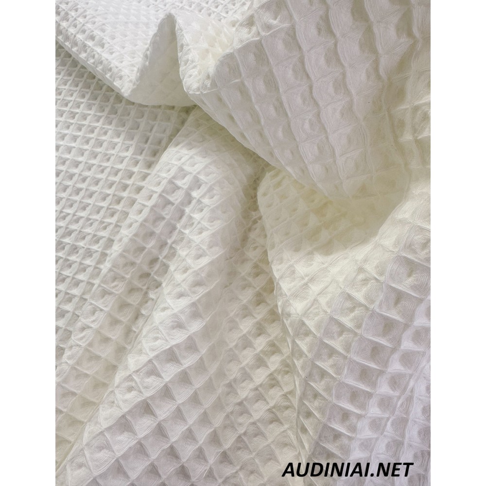 100% medvilnės, prancūziškas vaflinis audinys. Tokio tipo audinys, dar vadinamas koriuku, dažniausiai naudojamas virtuviniams ar vonios rankšluosčiams siūti. Anksčiau minėtas audimo būdas pasižymi tuo, jog puikiai sugeria įvairaus tipo skysčius. Šio gamintojo, itin purios tekstūros vaflinius audinius drąsiai rekomenduojame ir pledų, chalatų ar apsiaustų siuvimui. Langelio dydis 13 milimetrų x 13 milimetrų. Gamintojo papildomai apdorotas natūralus audinys prieš naudojimą jau nebeskalbiamas ir beveik nebesitraukia.